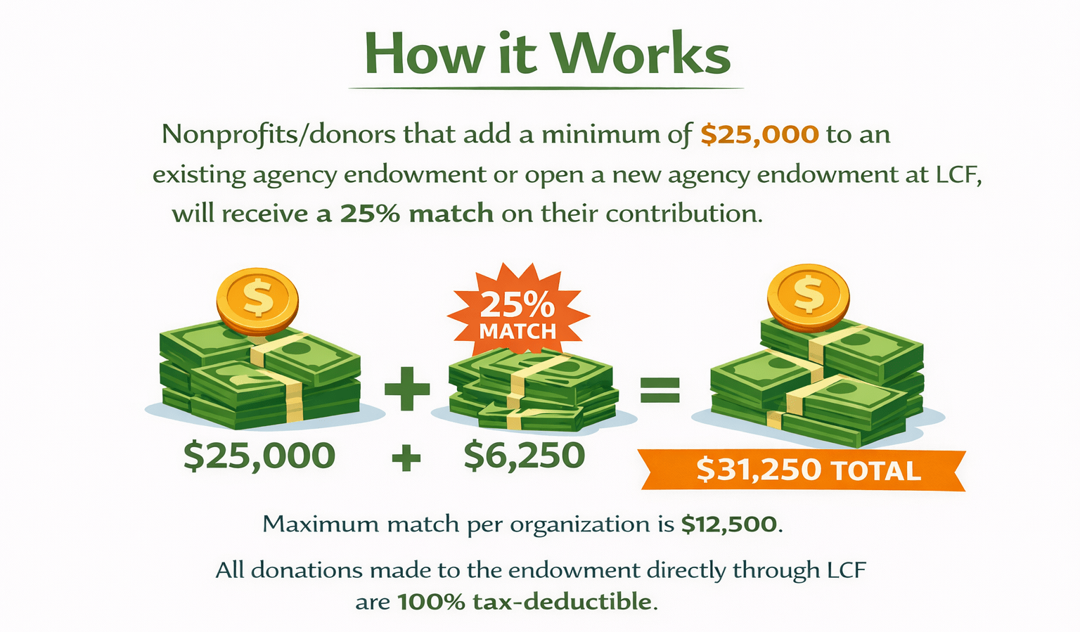→ Contribute a minimum of $25,000 to an existing agency endowment at LCF, or open a new one at LCF, and LCF will match 25 percent of the contribution, up to a maximum match of $12,500 per organization.