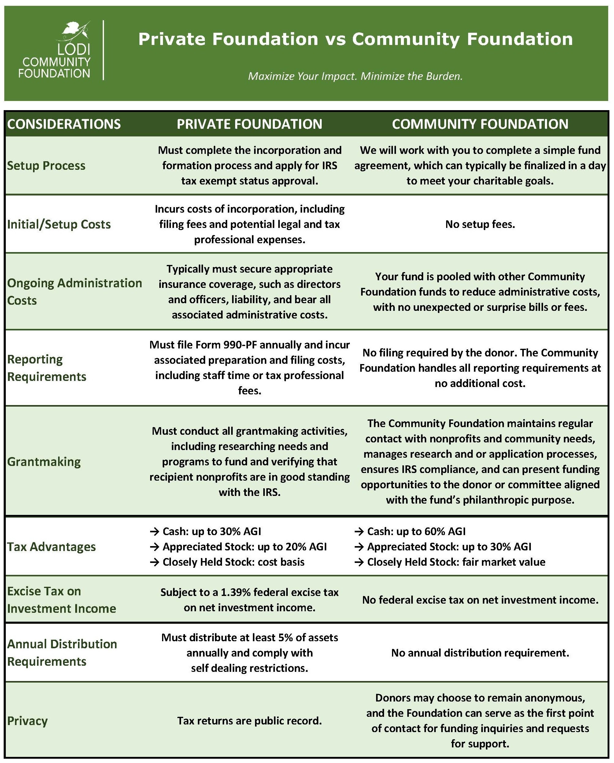 The chart below provides a comparison overview of key considerations when evaluating a Private Foundation versus a Fund at a Community Foundation. If you would like to focus on growing and deploying your charitable dollars while avoiding legal formation, annual tax filings, excise taxes, payout requirements, and ongoing compliance obligations, let’s talk. Contact us and a member of our team will follow up to answer your questions and discuss your goals so you can take the next steps with clarity and confidence.